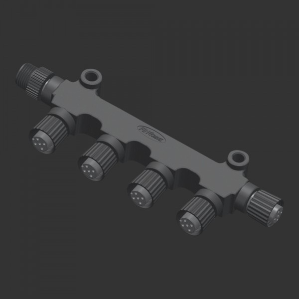 Verteiler für M12 System, 1 x Stecker, 5 x Buchse; Kunststoff; Abmessungen ohne Verpackung: H 46 mm x B 135 mm x T 20 mm
